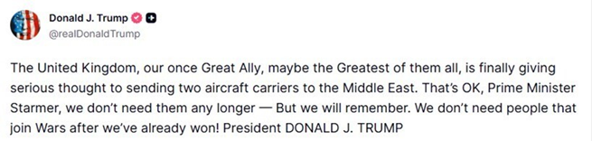 Trump je naveo da Ujedinjeno Kraljevstvo, „nekoć veliki i možda najveći saveznik“, „napokon ozbiljno razmatra“ slanje dva nosača zrakoplova u regiju, ali je istodobno dao do znanja da takva pomoć više nije potrebna.
